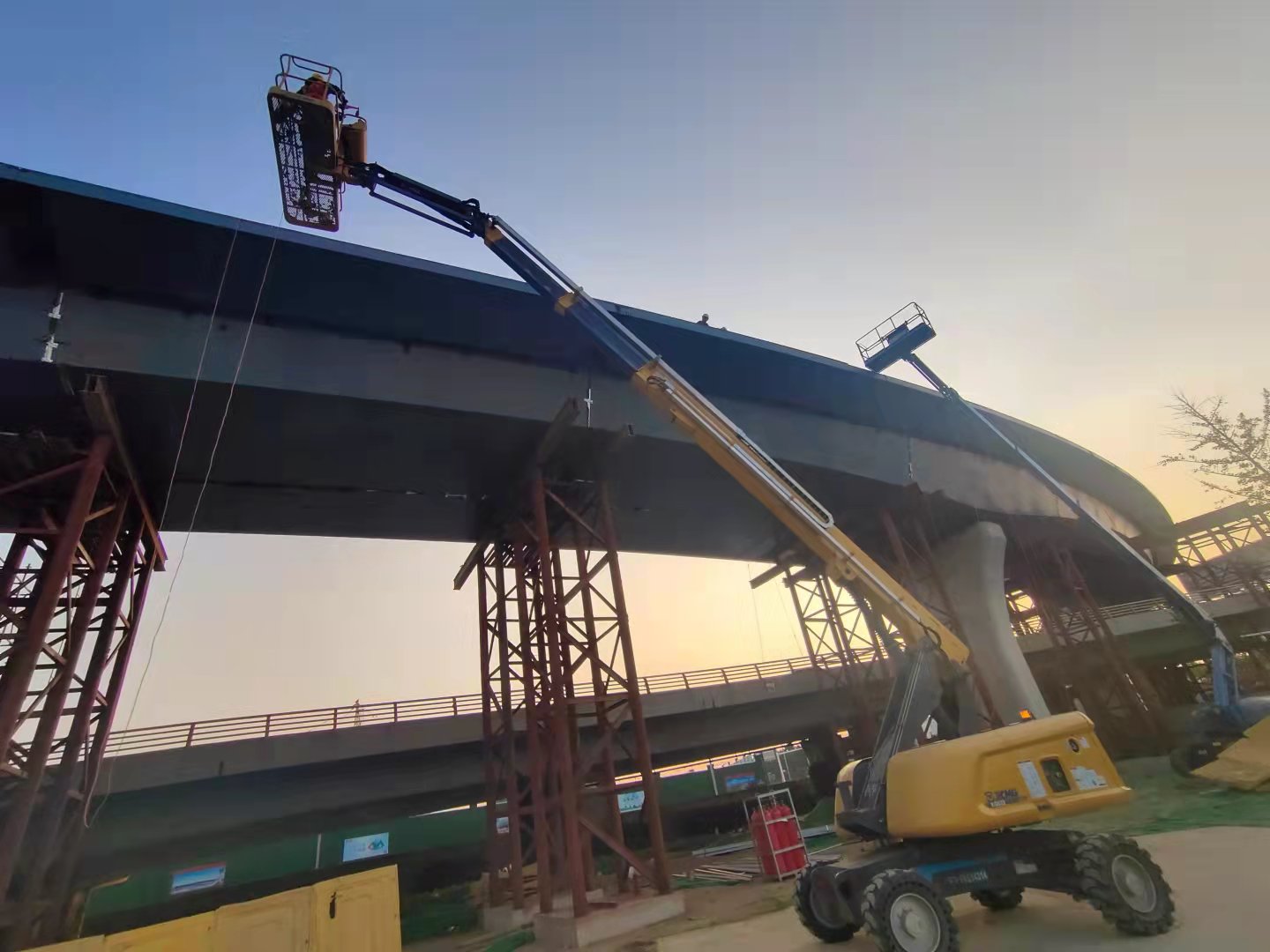 橋梁工程是煙臺蓬萊機場二期擴建工程的重要組成部分,也是整個項目的重要控制性工程。根據(jù)總體方案高架橋梁(G線)南起現(xiàn)狀T1進場高架處,沿T1高架向北跨過空港二路,與T1連接匝道(A線)合并,向西跨過迎賓九路、迎賓十路后到達T2航站樓,終點在航站樓西側(cè)向南轉(zhuǎn)彎后落地接地面出場道路,高架主線 (G線)總長度1635.104m。跨度為37米+62米+37米=136米,橋梁面積18565平方米,總用鋼量1300噸。