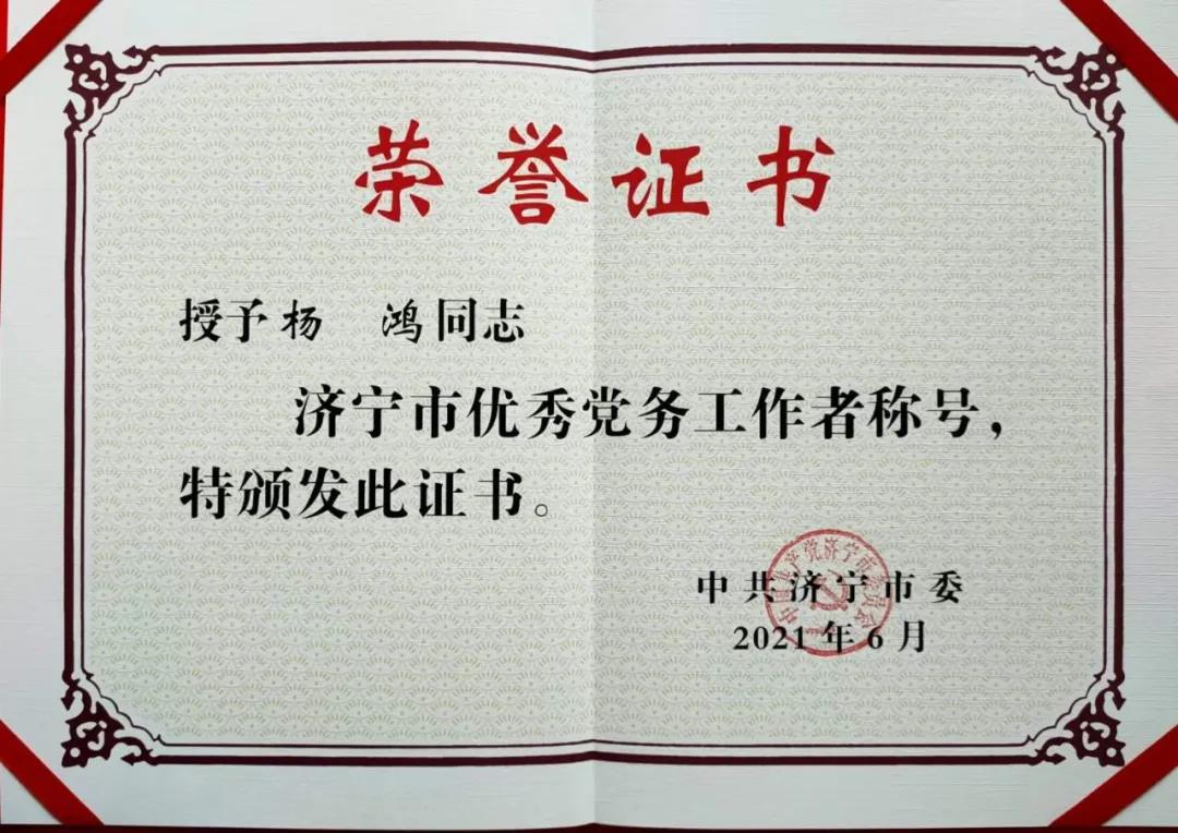 6月30日上午,濟(jì)寧市優(yōu)秀共產(chǎn)黨員、優(yōu)秀黨務(wù)工作者和先進(jìn)基層黨組織表彰大會(huì)在我公司承包施工幕墻項(xiàng)目的濟(jì)寧市圣都會(huì)議中心召開(kāi),公司黨支部書記楊鴻同志獲“濟(jì)寧市優(yōu)秀黨務(wù)工作者”榮譽(yù)稱號(hào),這是繼黨支部書記楊鴻同志榮獲曲阜市“紅帆能手”和被濟(jì)寧市委組織部授予“雙強(qiáng)六好”“兩新”組織示范點(diǎn)之后,公司在黨支部建設(shè)方面取得的又一項(xiàng)市級(jí)榮譽(yù)。