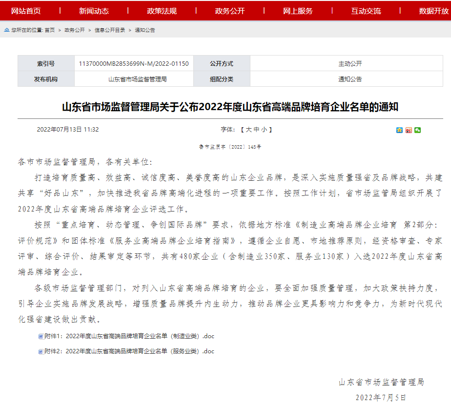 7月13日,山東省市場監(jiān)督管理局發(fā)布《關(guān)于公布2022年度山東省高端品牌培育企業(yè)名單的通知》,公布入選企業(yè)名單,公司成功入選2022年度山東省高端品牌培育企業(yè)名單(制造業(yè)類)。