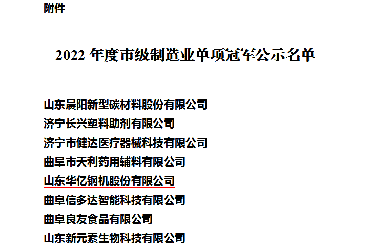 近日,濟寧市工業(yè)和信息化局組織開展了2022年度市級制造業(yè)單項冠軍企業(yè)評選工作。經企業(yè)自愿申報、各縣(市區(qū))工信主管部門推薦、專家評審等程序,2022年7月28日,濟寧市工業(yè)和信息化局公布了《2022年度市級制造業(yè)單項冠軍公示名單》,公司成功入選公示名單。